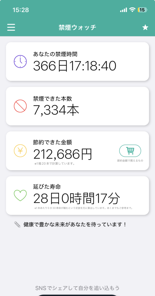 画像のように禁煙時間の計測、禁煙できた本数、節約できた金額、伸びた寿命まで表示してくれます。