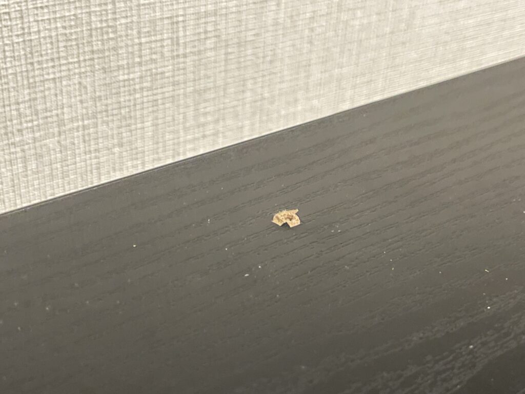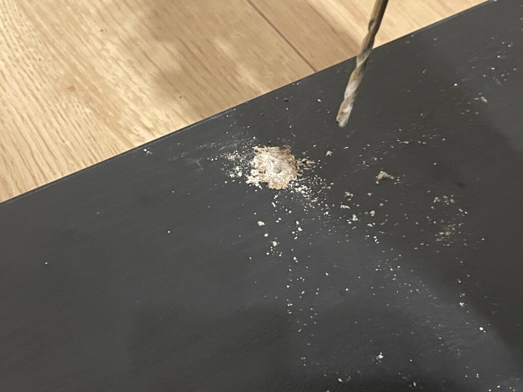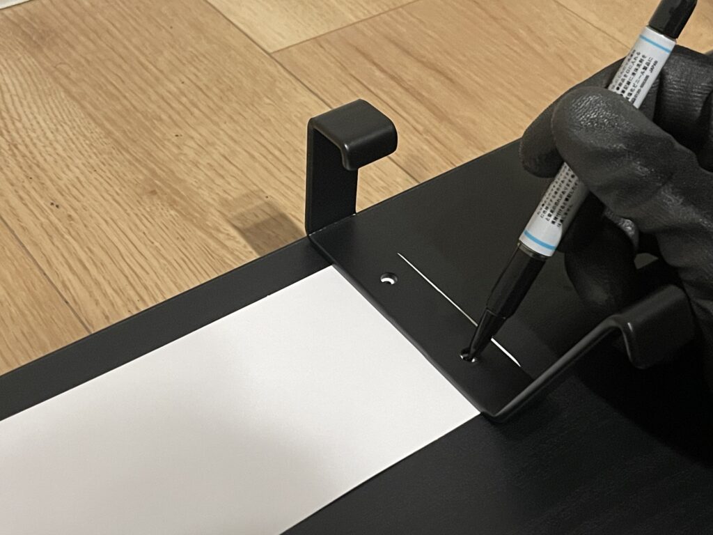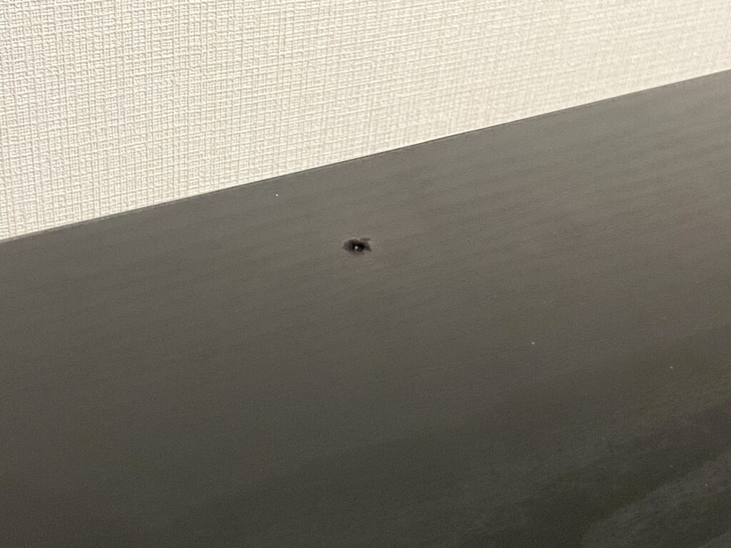 デスクを元に戻した時気づいたんですが、ドリルでの穴あけの際に天板を貫通していました(泣)マジックで塗りつぶしておきます(泣)