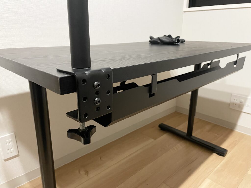 今回はネジ止め式の物を購入しましたが、他にもクランプ式もあります。こちらは横幅も調整できるタイプで便利です。デスクに穴をあけたくない方はこちらがオススメですね。
