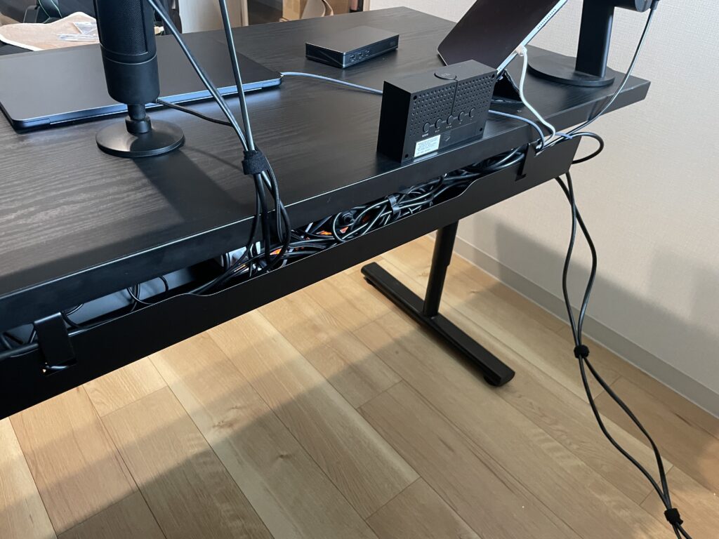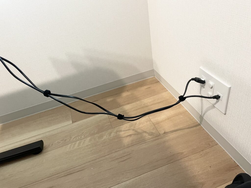 コンセントから伸びているケーブル、モニターから伸びているケーブル、USBハブから伸びてるケーブルなど各セクションごとにケーブルをまとめるのがコツです。