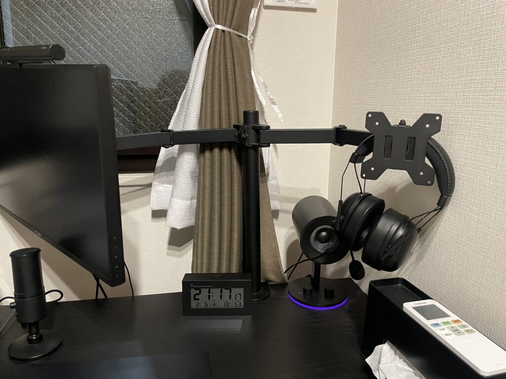 続いてはこちらの無駄なモニターアームですね。元々デュアルモニター用なんですが1枚しか使う予定がないので交換したいと思ってます。今はヘッドホンをかけています。